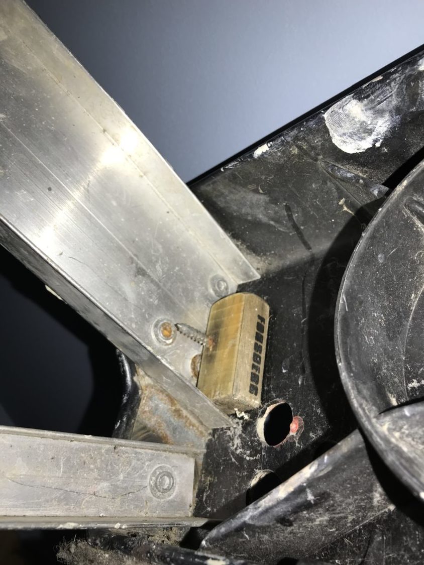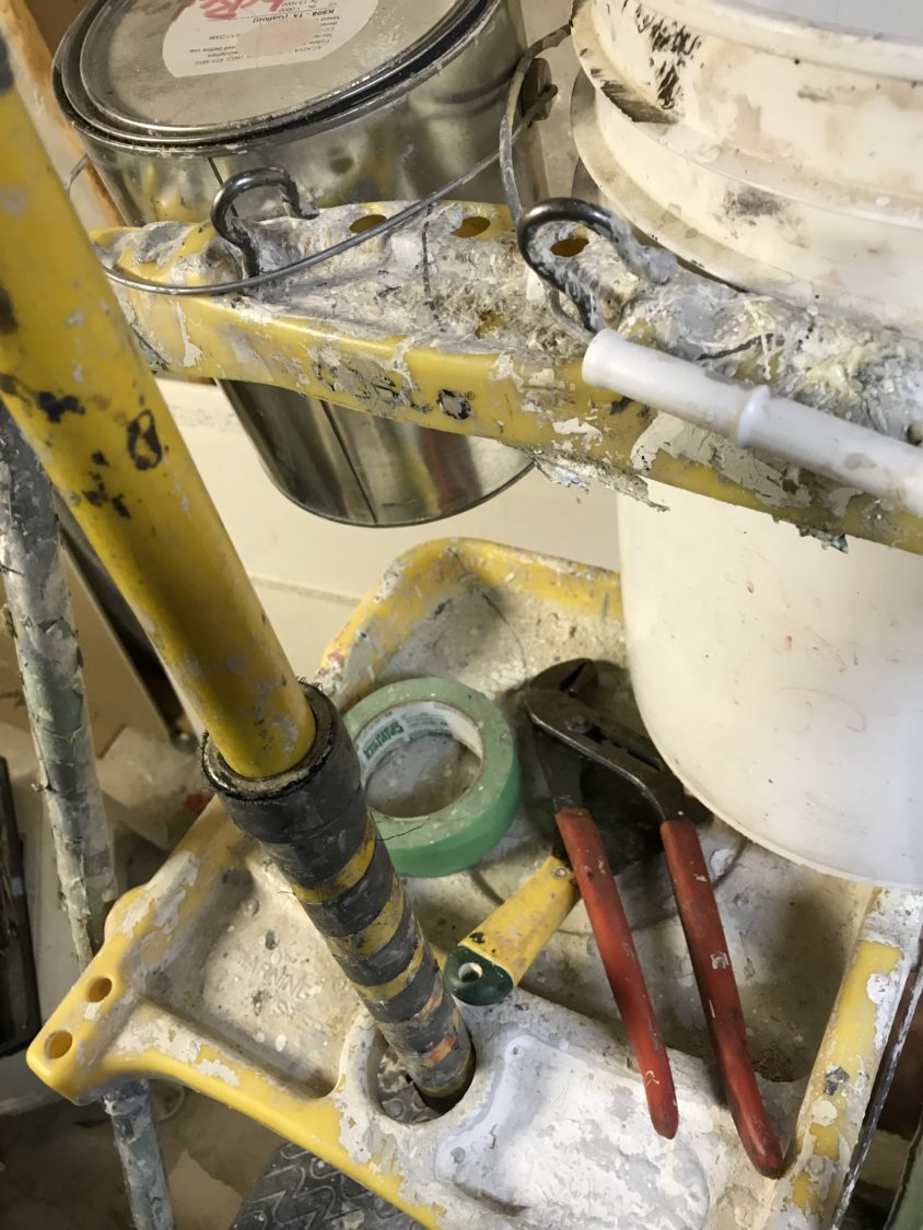 Nowadays, not many stepladders are wooden, and the plastic or metal ladders will not securely hold a hook. So you simply need to place a strong stick under the top of the ladder and drill baby drill. The stick will stay in place and you’ll be safe. Watch me try to shake the can off the ladder. Now it’s the best ladder in the world for painting!